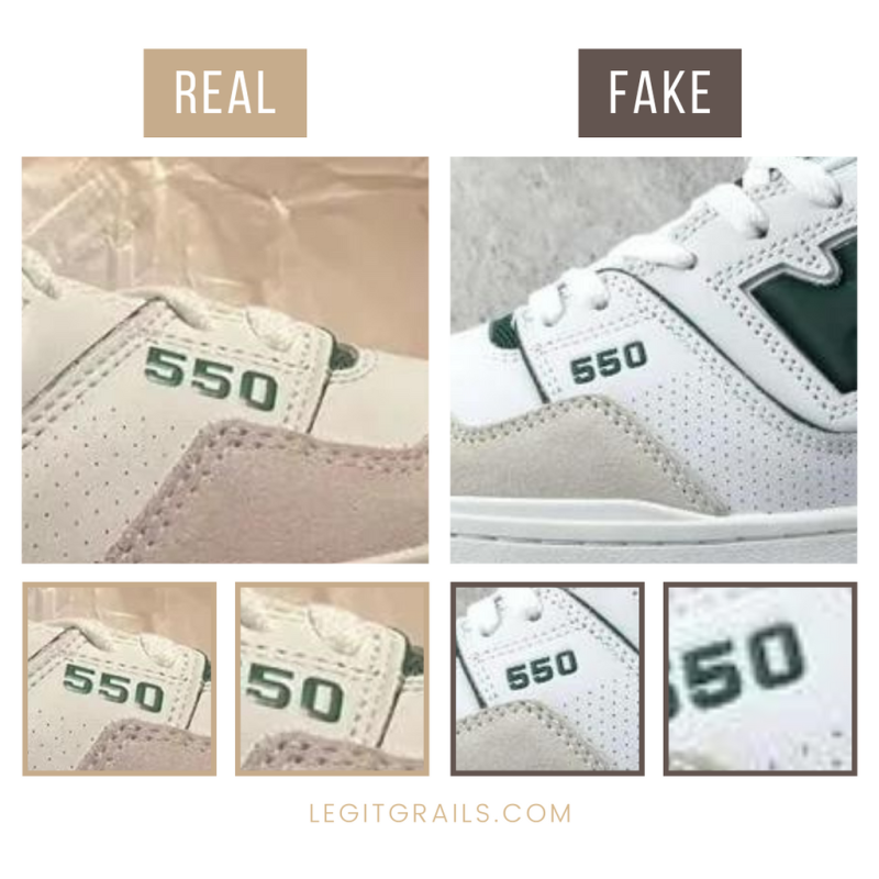 The stitching encircling the ‘N’ logos on the side panel should meld with the panel itself. As demonstrated in our replica example, an additional shading effect disrupts the unity. You should also look at the perforations on your new New Balance 550s. A quick scan reveals that authentic pairs have a deliberate spacing between perforations. You should focus on the initial row beneath the ‘550’ print to spot the difference. Here, the presence of precisely four visible perforations confirms authenticity. Yet, in contrast, our illustrative replica flaunts six conspicuous perforations beneath the ‘550’ print.