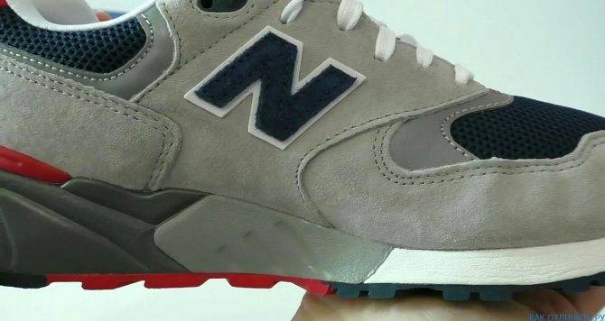 Кроссовки New Balance шьются из натуральной замши. В некоторых моделях (999, 574) имеются вставки на носке из сеточной ткани. На всех моделях имеются светоотражающие элементы. Что нужно учитывать при осмотре внешнего вида кроссовок New Balance: