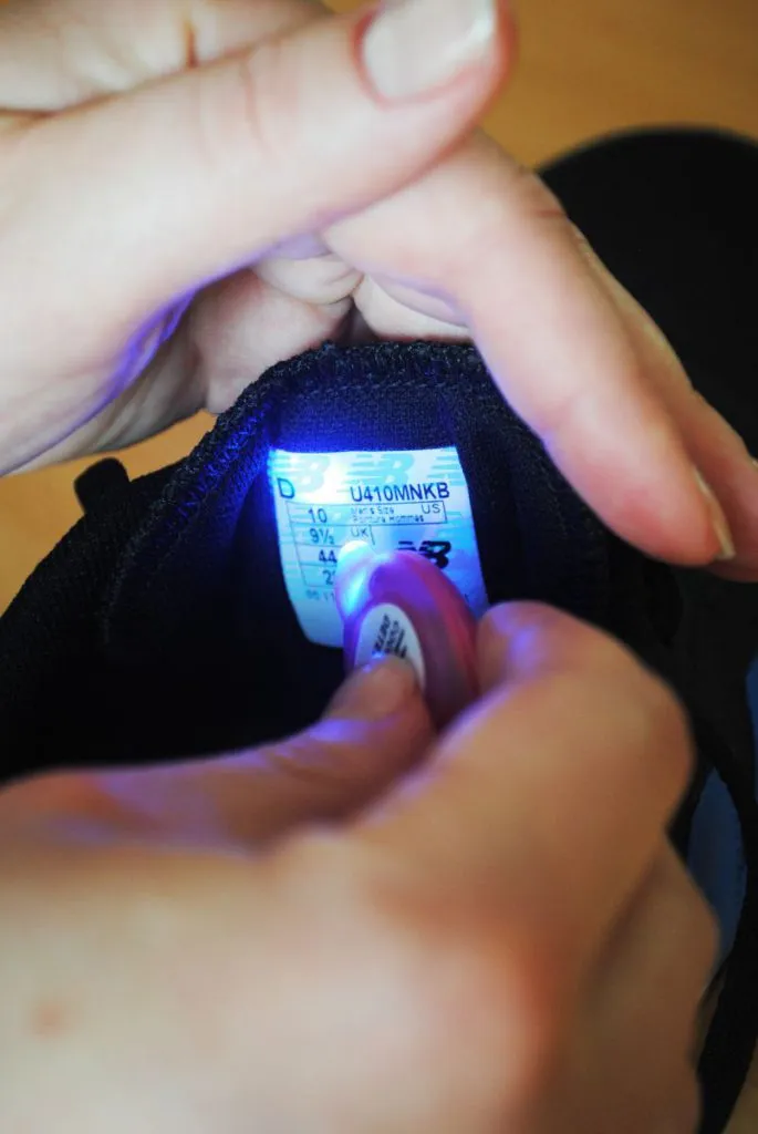 Возьмите фонарик, переверните язычок с инструктором и информацией производителя и подсветите его ультрафиолетовым светом в темноте. Логотип есть на оригинале, но нет на подделке. Это новый трюк New Balance, но он работает на всех моделях, независимо от страны-производителя тренера.