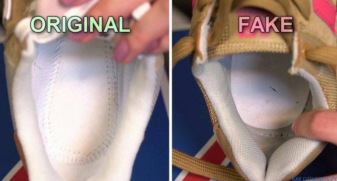 В первую очередь рекомендуется уделить внимание материалу подошвы. Фирменная обувь отличается податливой эластичной структурой, тогда как для подделки используется дешевая резина без характерных амортизационных свойств