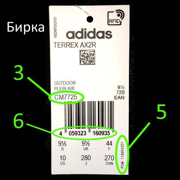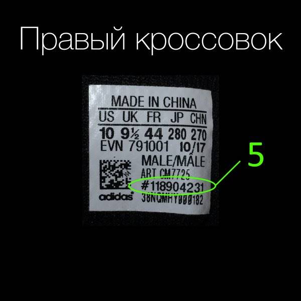 | штрихкод | высвечивается в списке на официальном сайте «Адидас» | не проявляется либо находит другую пару |