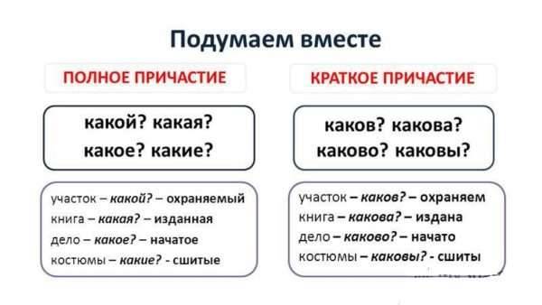Рассмотри пример: загруженная (полн. ф.) программа – программа (какова?) загружена (крат. ф.,ж.род); посаженное (полн. ф.) дерево – дерево (каково?) посажено (крат. ф.,ср. род); закрытые (полн. ф.) двери – двери (каковы?) закрыты (крат. ф., мн. ч.).