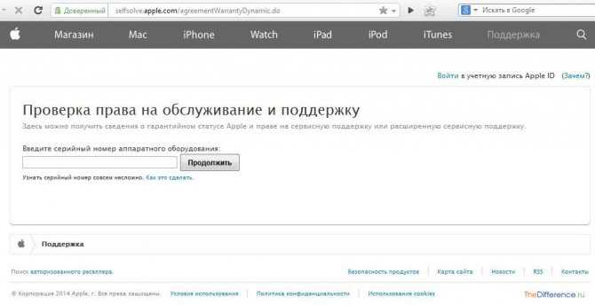 Откройте сайт https://selfsolve.apple.com/agreementWarrantyDynamic.do и введите серийный номер аппаратного оборудования в соответствующее окно. Нажмите «Продолжить» для получения информации о введенном серийнике.
