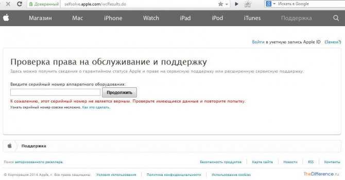 Если же в руках у вас китайская подделка, то вы увидите надпись «К сожалению, этот серийный номер не является верным. Проверьте имеющиеся данные и повторите попытку».