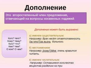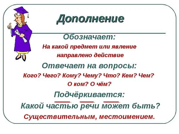 Дополнение — второстепенный член предложения, который обозначает предмет или лицо, являющееся объектом действия. Дополнение выражено сказуемым и отвечает на вопросы косвенных падежей: кого? чего? кому? чему? что? кем? чем? о ком? о чём?