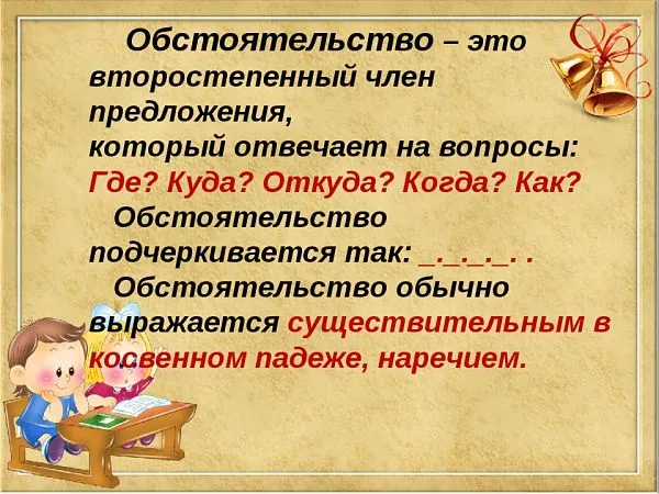 Обстоятельство — это второстепенный член предложения, обозначающий признак, качество совершения действия, его условие или состояние.