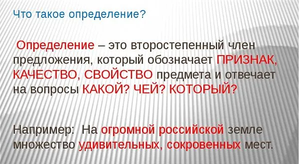 Определение — это второстепенный член предложения, обозначающий признак предмета и отвечающий на вопросы «какой?», «чей?».