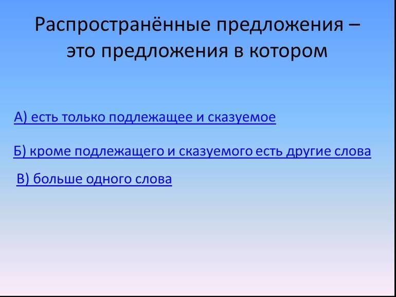 Распространённые — предложения, в которых имеются как главные члены (подлежащее, сказуемое), так и второстепенные. К ним относятся: