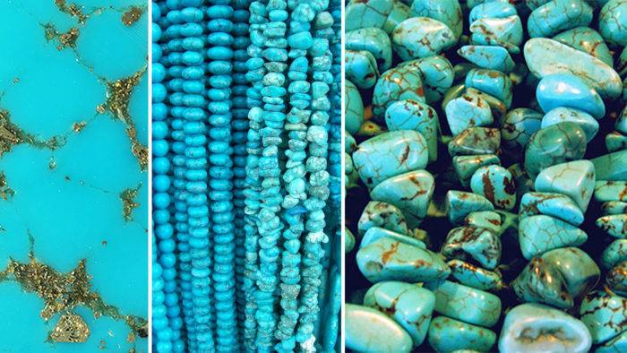 Бирюзу подделывают пластмассой, бирюзой низкого качества, эмалью и дешевыми минералами. Отличить оригинал от подделки сложно. Только время поможет выявить фальшь: через несколько лет ненастоящая бирюза потемнеет и покроется некрасивыми серовато-грязными пятнами.
