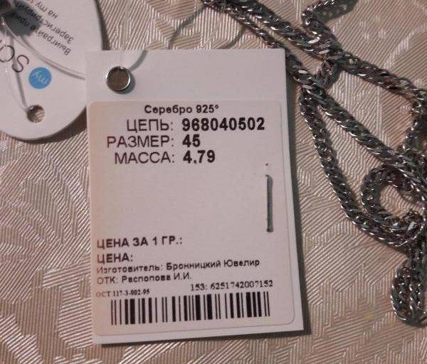 На ярлыке указываются все характеристики изделия, включая вес, размеры, пробу и материал изготовления.