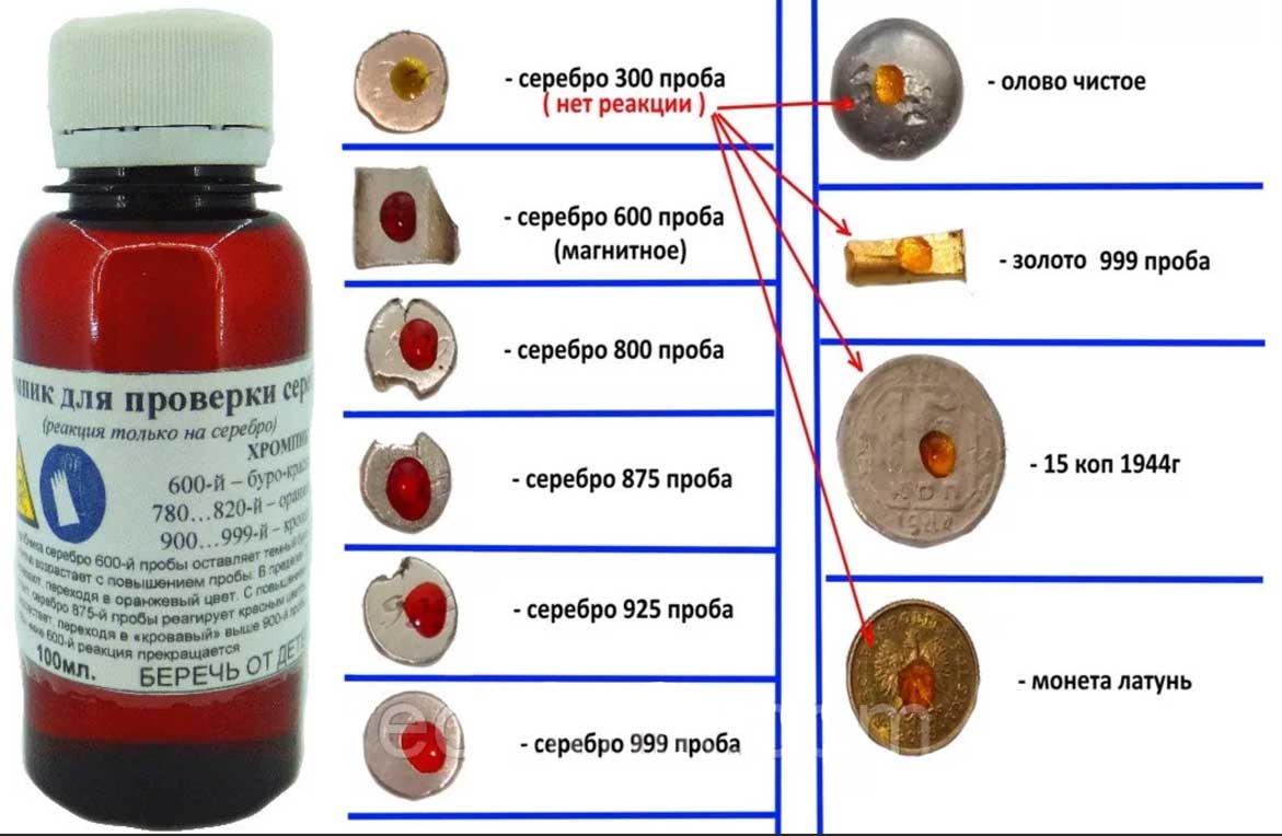 Если имеется дело с изделиями без клейма, то можно самостоятельно узнать пробу серебра с помощью специальных реагентов. Такой способ гарантирует достоверность и прост для самостоятельного опыта. Приобрести набор можно в ювелирном магазине.