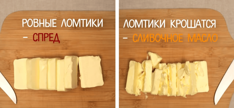 Если у вас возникли сомнения по поводу натуральности уже дома после покупки, то советуем заморозить масляный брусок, а затем попробовать порезать ножом. Если продукт натуральный, то масло должно буквально трескаться и с трудом мазаться на хлеб. Если продукт режется идеальными кусочками в замороженном состоянии, то перед вами 100% подделка.