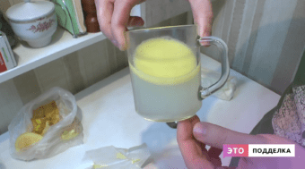 В маргарин, а также в спреды и прочие искусственные продукты, часто добавляют красители, например, каротин. Эксперимент с водкой позволяет узнать, есть ли они в продукте. Для этого нужно нагреть немного водки до температуры в 55-60 градусов и залить ею кусочек. Если водка окрасилась в желтый цвет, значит, в продукте есть красители. Если же с ней ничего не произошло, то красителей нет.