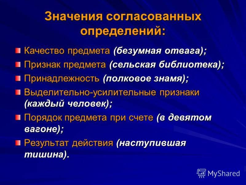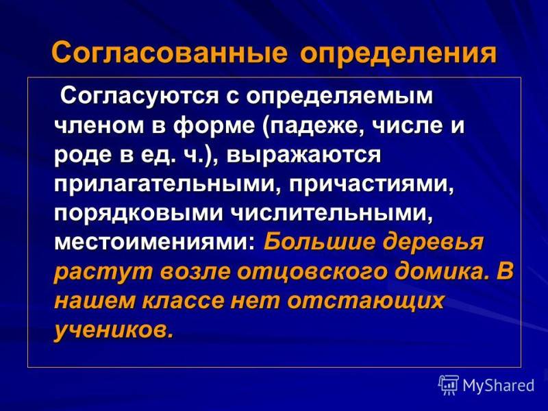 Согласованные определения совпадают с определяемым словом по грамматическим признакам, чаще всего находятся в препозиции, и установить их связь не представляет труда.