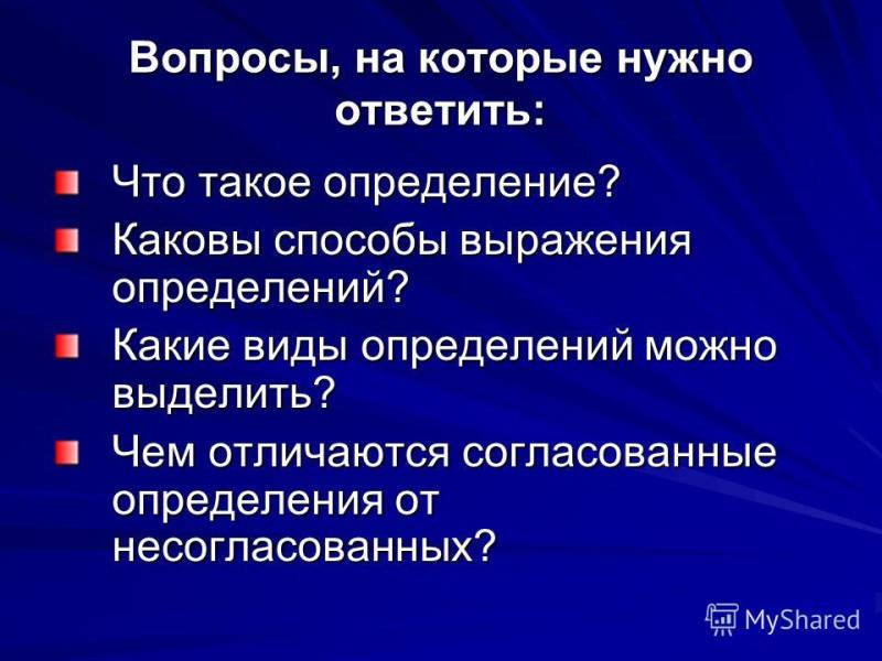 Вопросы, на которые нужно ответить: Что такое определение? Каковы способы выражения определений? Какие виды определений можно выделить? Чем отличаются согласованные определения от несогласованных?