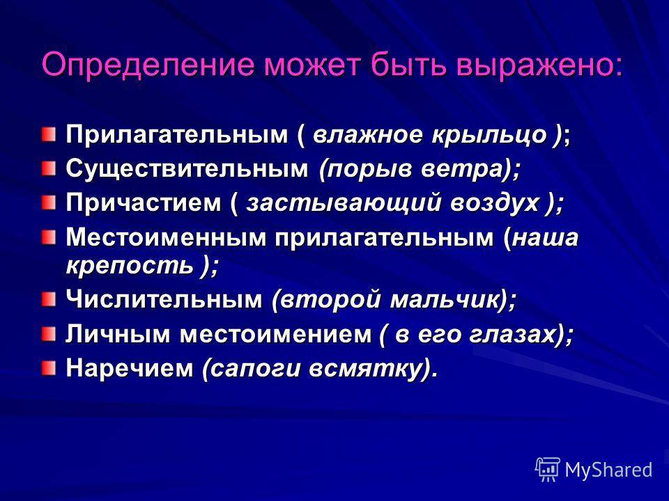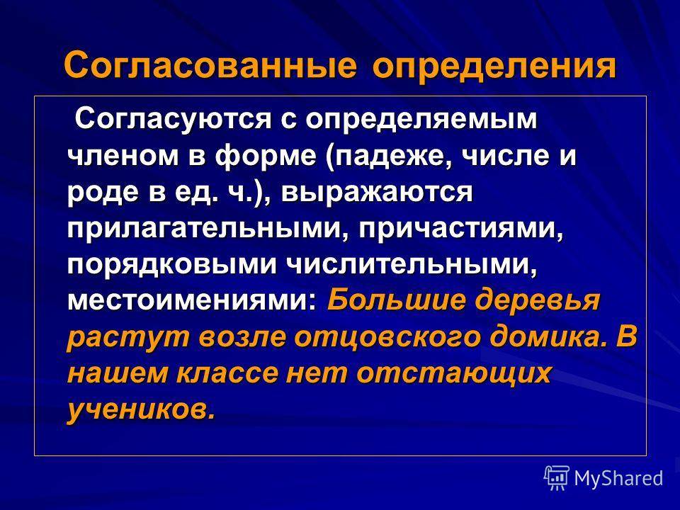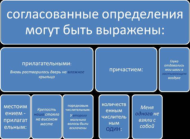 и могут быть выражены именем прилагательным, причастием, причастным оборотом или порядковым числительным. Они связаны с определяемым словом способом согласования, то есть употребляются в том же числе, роде и падеже, что и определяемое слово: