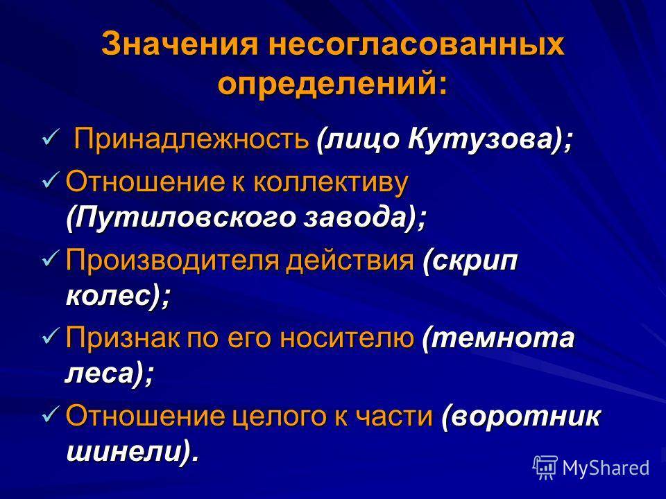 Чаще всего они могут быть выражены именем существительным с предлогом и без предлога и иметь разные значения. Способы выражения несогласованного определения, примеры: