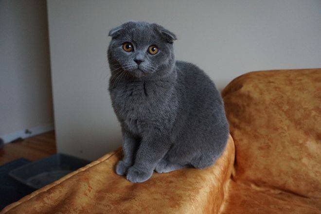 - Если пушистый котенок уверенно встает на задние лапки или сидит на бедре одной ноги, подогнув вторую конечность под тело, значит, этот малыш является настоящим представителем шотландской породы. У британских кошек таких привычек не наблюдается.