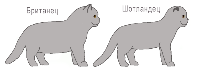 | Британские коты бывают только прямоухими | Шотландские коты бывают: — скоттиш стайт (прямоухие) — скоттиш фолд (вислоухие) |