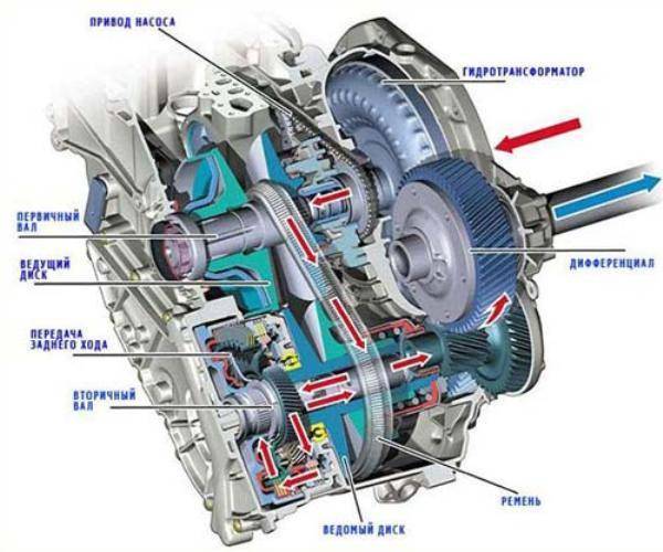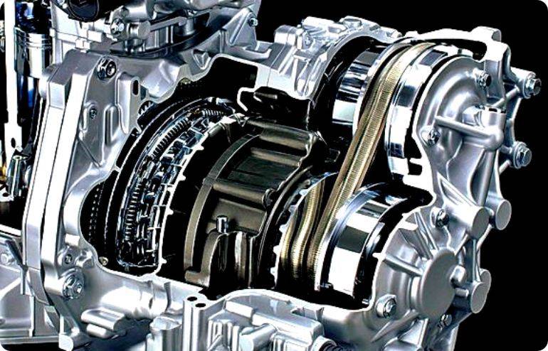 Вариатор обеспечивает передачу крутящего момента при помощи металлического ремня, который контактирует с 2 коническими шкивами. Для передачи момента от двигателя к трансмиссии используется гидротрансформатор. За счет изменения диаметра шкива на ведущем и ведомом валах обеспечивается плавное изменение частоты вращения вторичного вала.