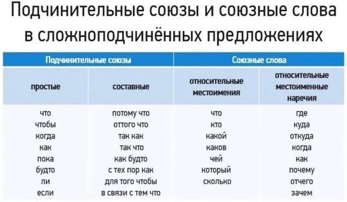 Примеры союзов или подчинительных слов, которые могут свидетельствовать о наличии сложного предложения: