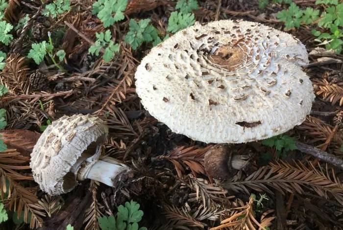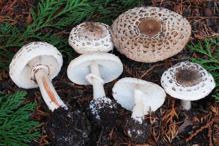 - Чешуйки на шляпках у зонтиков есть всегда, и они темнее шляпки. У поганки они бывают очень редко, к тому же «хлопья» эти — почти белые: намного светлее основного фона шляпки.