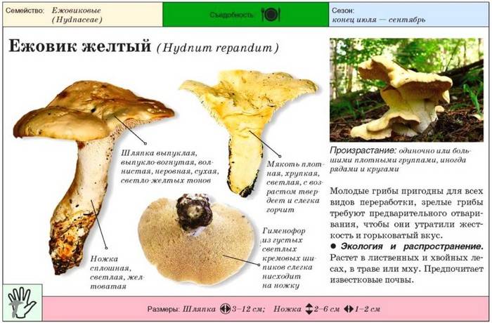Но если перепутали эти грибы — ничего страшного! Ежовик желтый — хороший съедобный гриб, особенно молоденький. В старости его мякоть приобретает «резиновую» консистенцию.