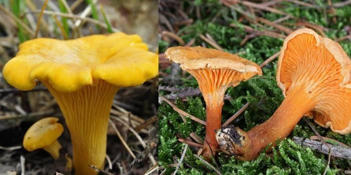 В лесах средней полосы можно встретить ложную лисичку. Она имеет более яркий желтый окрас с оранжевым оттенком, характерный для несъедобных грибов, и гладкую поверхность шляпки. У съедобной лисички края более рваные, а форма шляпки неправильная. Цвет у съедобного гриба менее интенсивный.