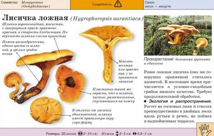 Но есть у лисички и несъедобный двойник. Правда, именно несъедобный, но не ядовитый. У этого гриба неприятный, горький вкус, да и запах «не очень». Его правильное название — Оранжевая говорушка (Hygrophoropsis aurantiaca), хотя в народе ее обычно называют ложной лисичкой.