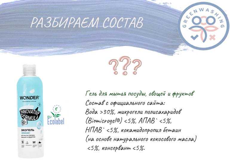 Как мы видим, даже у средства с сертификатом Ecolabel состав указан не по INCI. Возникают вопросы к происхождению ингредиентов? Какие ПАВ? Какой консервант?