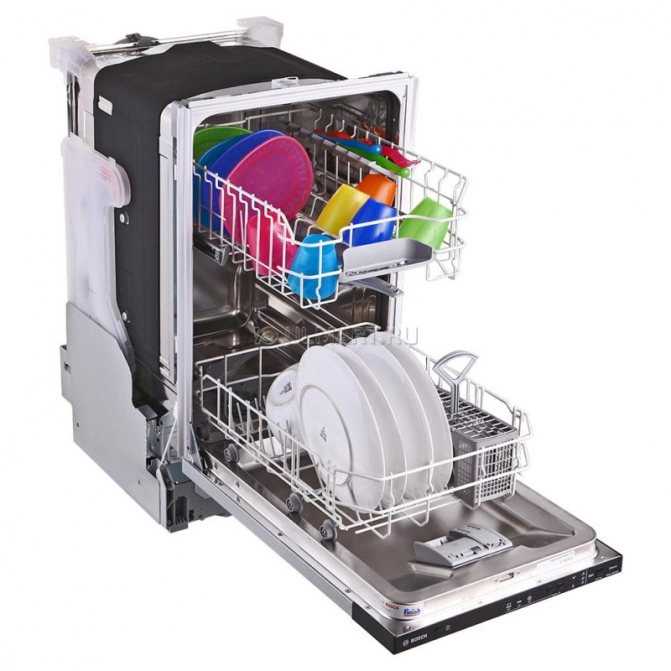 - Узкий, шириной 45 см. Узкая модель может вместить 6-9 комплектов, что достаточно для семьи из 2-4 человек. Ценник такой техники ниже, чем у стандартных аналогов.