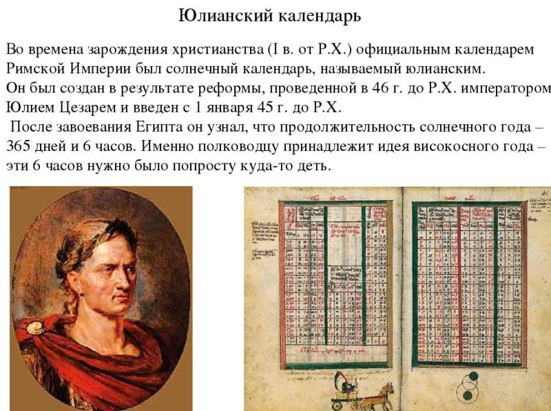 Самый первый календарь нельзя назвать точным. В нем не отражалось то, что помимо целых суток (дней) в году «набегает» еще почти 6 добавочных часов. С учетом «лишнего» времени некоторые исправления в календарь позже внес Юлий Цезарь, поэтому его версию календаря стали называть юлианским. Но он все еще был «сыроват» и тоже не был точен, хотя долгое время его придерживались на большинстве территорий земного шара.