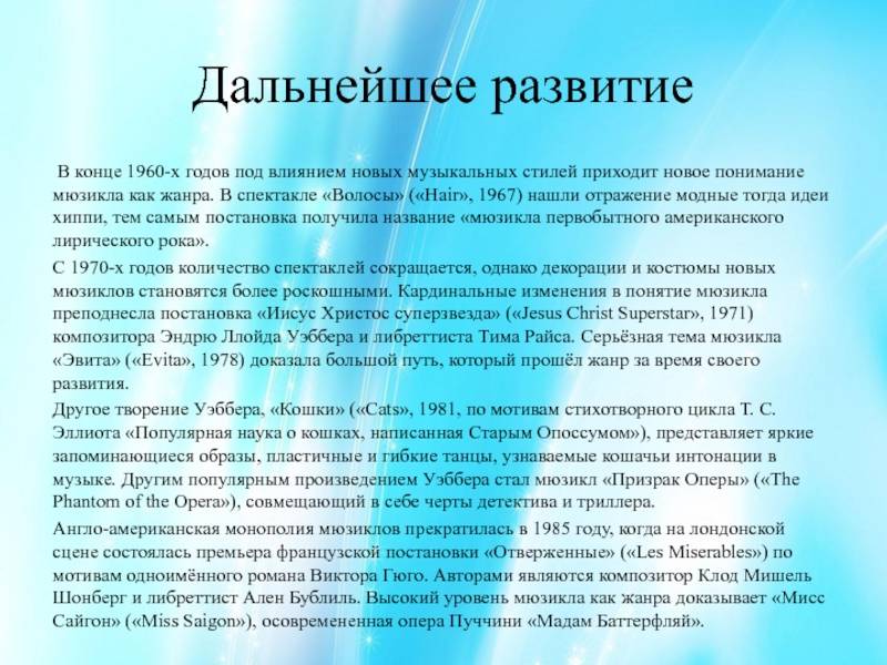 приходит новое понимание мюзикла как жанра. В спектакле «Волосы» («Hair», 1967) нашли отражение модные тогда идеи хиппи, тем самым постановка получила название «мюзикла первобытного американского лирического рока».С 1970-х годов количество спектаклей сокращается, однако декорации и костюмы новых мюзиклов становятся более роскошными. Кардинальные изменения в понятие мюзикла преподнесла постановка «Иисус Христос суперзвезда» («Jesus Christ Superstar», 1971) композитора Эндрю Ллойда Уэббера и либреттиста Тима Райса. Серьёзная тема мюзикла «Эвита» («Evita», 1978) доказала большой путь, который прошёл жанр за время своего развития.Другое творение Уэббера, «Кошки» («Cats», 1981, по мотивам стихотворного цикла Т. С. Эллиота «Популярная наука о кошках, написанная Старым Опоссумом»), представляет яркие запоминающиеся образы, пластичные и гибкие танцы, узнаваемые кошачьи интонации в музыке. Другим популярным произведением Уэббера стал мюзикл «Призрак Оперы» («The Phantom of the Opera»), совмещающий в себе черты детектива и триллера.Англо-американская монополия мюзиклов прекратилась в 1985 году, когда на лондонской сцене состоялась премьера французской постановки «Отверженные» («Les Miserables») по мотивам одноимённого романа Виктора Гюго. Авторами являются композитор Клод Мишель Шонберг и либреттист Ален Бублиль. Высокий уровень мюзикла как жанра доказывает «Мисс Сайгон» («Miss Saigon»), осовремененная опера Пуччини «Мадам Баттерфляй».