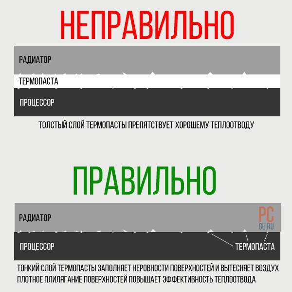 Основная цель термопасты – заменить собой воздух, который имеется между неплотно прилегающими поверхностями. Поэтому необходимо наносить максимально тонкий слой.