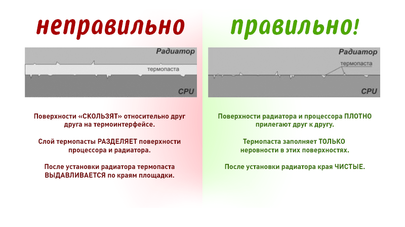 С другой стороны, можно попасть в ловушку. Если нанести слишком мало термопасты, то она не сможет заполнить неровности поверхностей и будет плохой теплообмен. Поэтому, рекомендуется выровнять заранее поверхность подложки системы охлаждения и теплораспределителя на процессоре или видеокарте.