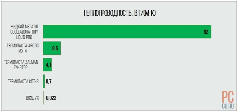 Термопаста используется для того, чтобы заменить собой воздух между соприкасаемыми поверхностями, тем самым увеличивая теплопроводность. Зачем? Давайте вспомним, каким коэффициентом теплопроводности обладает воздух? Правильно, предельно низким. Или почти никаким. А теперь посмотрим на следующую диаграмму, которая показывает теплопроводность современных термопаст и жидкого металла.