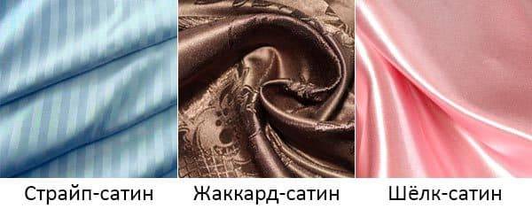 - шелк-сатин — плотный материал, особенностью которого является наличие двух сторон: изнаночная хлопковая, а лицевая — шелковая; мако-сатин — 100 % хлопчатобумажная ткань без добавления иных волокон. Производится из тонких нитей с обязательным соотношением поперечных и продольных нитей — 31 к 50; жаккард-сатин — ткань с рисунком с лицевой и изнаночной стороны. Рисунок получается именно благодаря ткацкому переплетению. Разновидностью является страйп-сатин с рисунком в виде полос; купонный сатин — материал с нанесенным рисунком определенного размера под конкретное изделие. Например, постельное белье: пододеяльники и наволочки имеют завершенные композиции, а не просто повторяющийся узор.