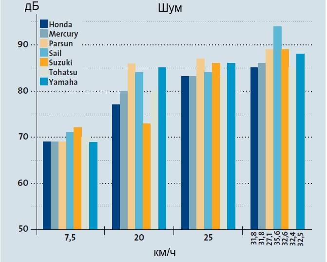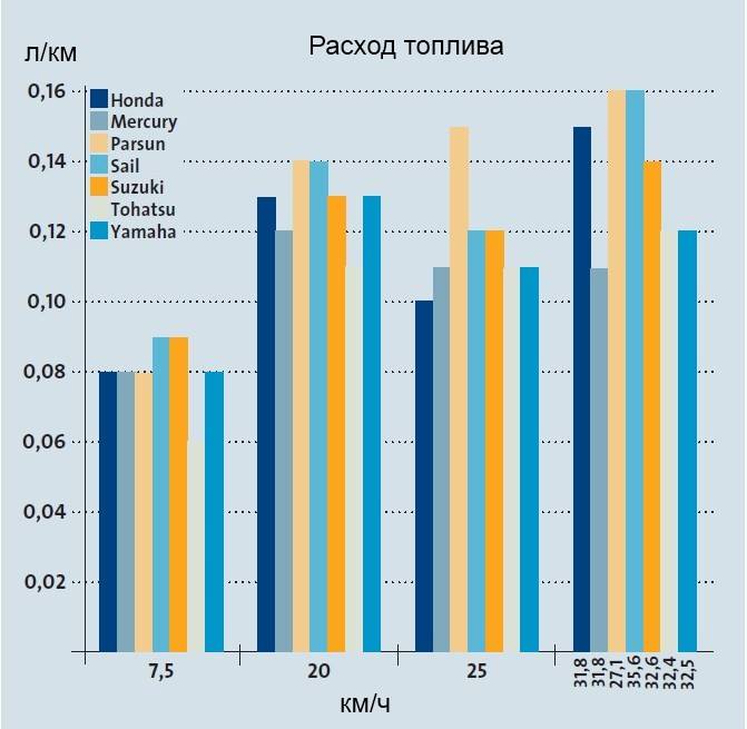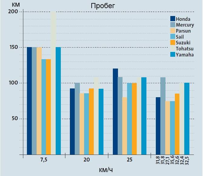Suzuki в паре с правильным гребным винтом смог разогнать лодку до 32,6 км/ч и до 25 км/ч ускорился за 8,2 секунды. Моторы Сузуки и Тохатсу по комбинации показателей скорость и ускорение уверенно держаться на 2 и 3 местах. У Yamaha максимальная скорость повыше чем у Tohatsu, но вот ускорение ему дается труднее. Honda за счет хорошего ускорения добирается до цели быстрее Mercury, хотя максимальная скорость у обоих моторов одинаковая.