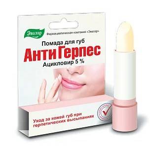 Помада «АнтиГерпес» помогает предотвратить появление пузырьковой сыпи на губах. Благодаря своему составу средство увлажняет и питает кожу губ, исключает ее шелушение. Помаду следует наносить на губы тонким слоем не менее 5 раз в день.