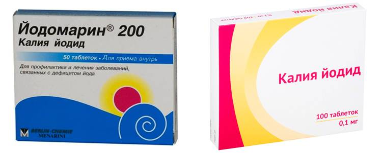Немецкий Йодомарин и большинство российских аналогов, как правило, под названием просто «Калия йодид» (см. таблицу ниже) имеют одно и то же действующее вещество — соль калия в соединении с йодом. Все содержат по 100 или 200 мкг (т.е. микрограммы, равные соответственно 0,1-0,2 мг) в пересчете на элементарный йод без калия. Их можно принимать ежедневно по 100 или 200 мкг, некоторые врачи могут назначить еженедельный разовый прием сразу по 1 мг йода или даже с менее частыми интервалами до нескольких месяцев в соответственно больших дозах.