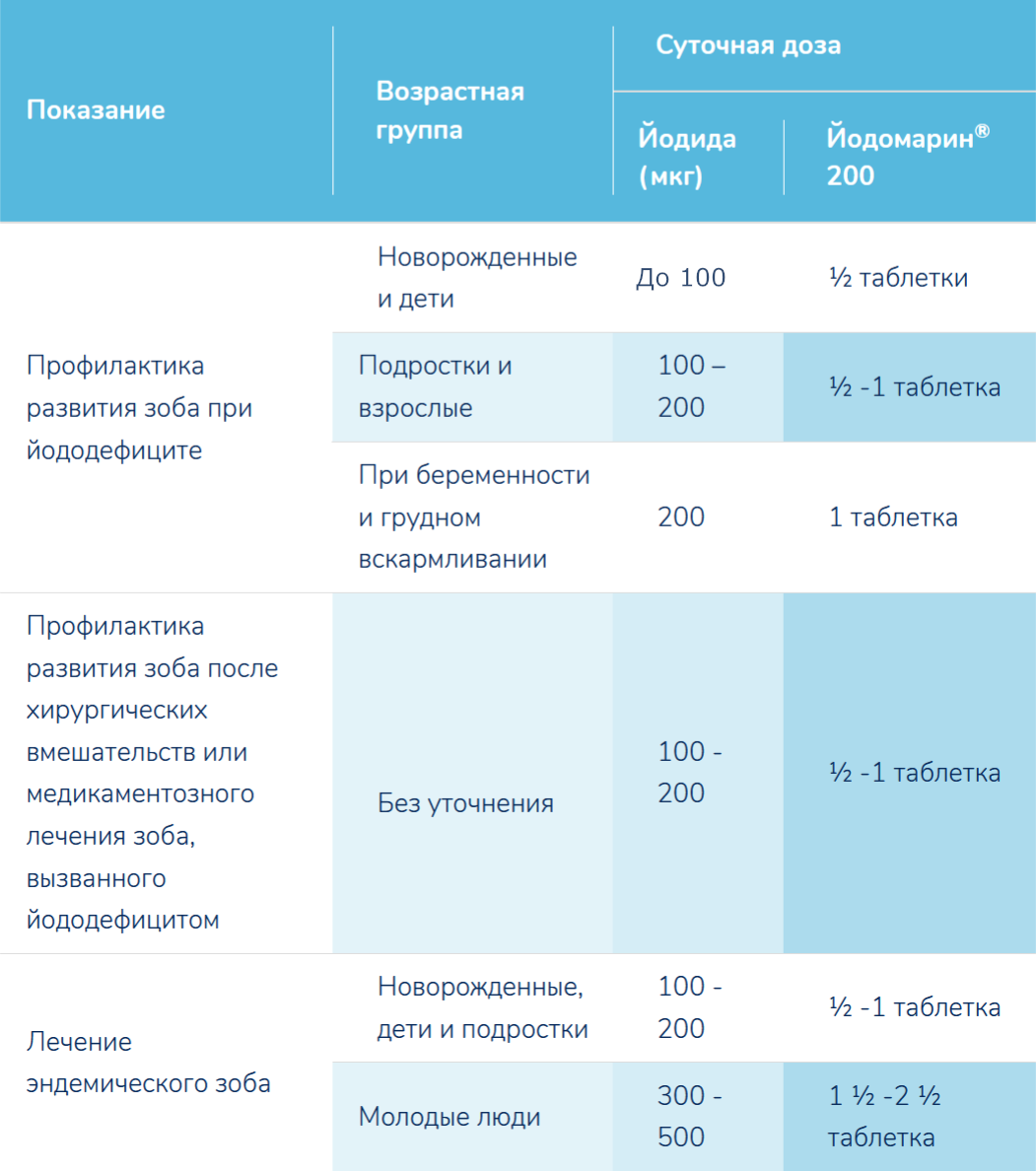 Главная цель приема Йодомарина и подобных препаратов состоит в том, чтобы обеспечить примерно 150-200 мкг йода в день (суточная норма взрослых), если этого не удается добиться диетическими источниками. Могут быть показаны при лечения нетоксического эутиреоидного зоба, но режим приема определяется врачом.