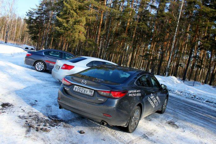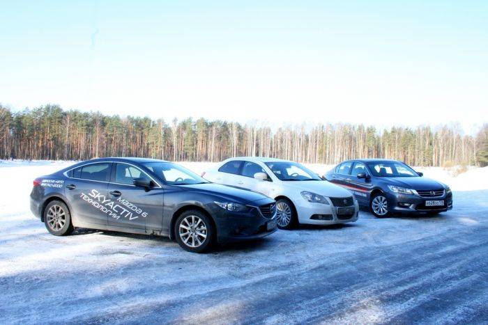 Mazda 6 в этом тесте выделялась на фоне соперников. Как мы уже говорили, она имеет 2-литровый мотор (против 2,4 л у конкурентов), выдающий 150 л.с. и 210 Нм момента. Впрочем, сравнивать Мазду с Хондой и Сузуки можно, так как малый вес (1370 кг) компенсирует нехватку мощности с лихвой (смотри данные по энерговооруженности).