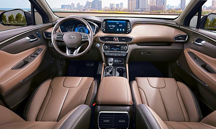 Салон нового Santa Fe тоже серьёзно обновился. Изменения в нём нельзя назвать радикальными, но в то же время они они делают интерьер более современным и запоминающимся. Прежде всего заметна новая центральная консоль, как бы парящая над тоннелем. Цифровая комбинация приборов так же, как и на соплатформенном Киа Соренто, в одно мгновение переключается на изображения с видеокамер кругового обзора а также привязывает конкретный стиль оформления к выбранному режиму движения.