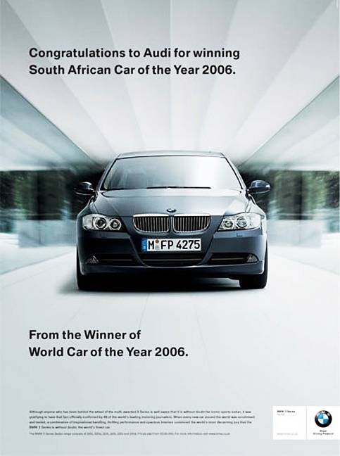 Признанный мировым автомобилем — 2006, БМВ «мило поздравлял» конкурентов с победой в номинации «Машина года» в Южной Африке. Столь жестокой обиды Audi простить не смогли…