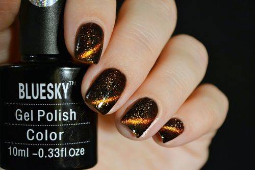 Кроме стандартных цветных гелей производитель предлагает клиентам отдельные оригинальные фактурные коллекции. Одна из самых интересных – «Кошачий глаз». У этих лаков особый блеск с загадочными разводами, которые очень эффектно играют на свету. Блики, напоминающие 3D, создаются под воздействием магнита. Магнитный песок в составе материала начинает двигаться вслед за ним и образует необычный рисунок. Название взято от одноименного камня, на который похож своим мерцанием такой маникюр. В коллекции огромный выбор цветов (порядка 50).