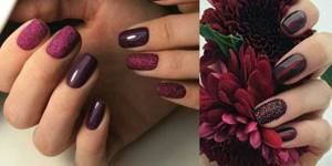 Используются крупные блестки и стружка, как в прозрачно-изумрудном с золотыми голографическими блестками разных размеров, или светлый темно-лиловый, с крупными и средними золотыми и серебряными микроблестками.