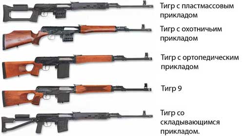 - Карабин «Тигр» в исп. 02 – отличается от остальных модификаций наличием складного металлического приклада, похожего по приклад СВДС. При складывании приклада блокируется ударно-спусковой механизм, сделано это для целей безопасности.
