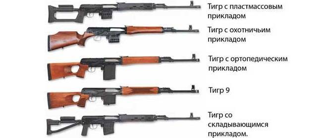 Конструкция «Тигра» с годами менялась, поэтому существуют разные модификации карабина – в некоторых из них мушка регулируется по высоте, в некоторых присутствует пламегаситель, длина ствола может составлять 590 или 620 мм вместо 530 мм. В продаже встречаются карабины как со стандартным охотничьи прикладом, так и с ортопедическим, в котором есть отверстие для руки.
