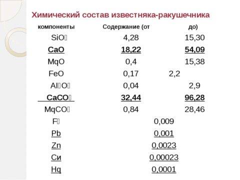 Ракушечник, по сути, это известняк, который состоит из соли кальция. Вне зависимости от месторождения камня, состав его всегда приблизительно одинаков.