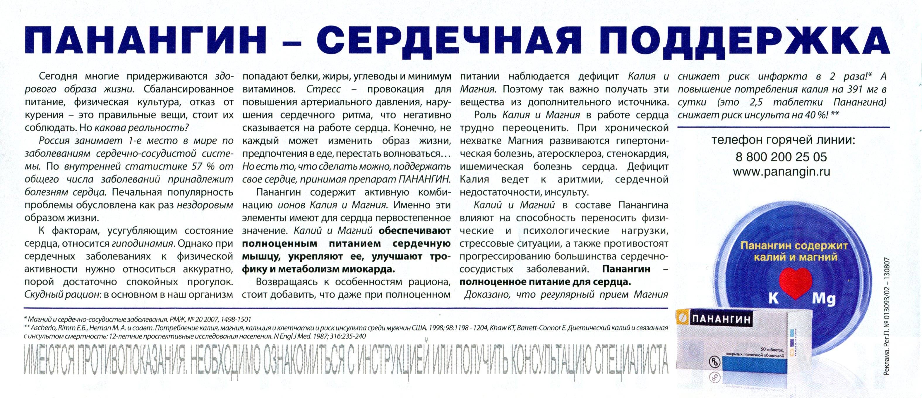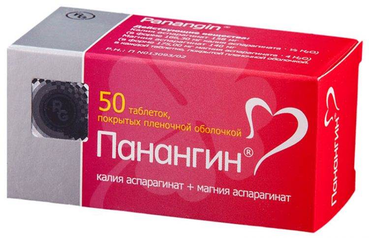 | Калия аспарагинат + магния аспарагинат | Панангин 158 мг + 140 мг в таблетке №50 45.2 мг/мл + 40 мг/мл 10 мл в ампуле №5 Аспаркам 175 мг + 175 мг №56 10 мл в ампуле №10 | Венгрия Россия | 137 147 73 92 |